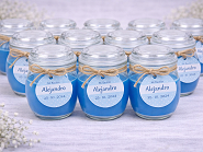 Esta vela aromática viene en un elegante frasco de cristal con tapa, decorado con un lazo de cuerda y una etiqueta personalizable. Puedes adaptarla con el mensaje o diseño que prefieras para hacerla única en cada ocasión. Ideal para bodas, comuniones, bautizos y eventos, su fragancia suave y acogedora crea un ambiente especial.