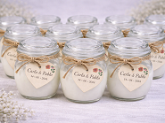 Esta vela aromática viene en un elegante frasco de cristal con tapa, decorado con un lazo de cuerda y una etiqueta personalizable. Puedes adaptarla con el mensaje o diseño que prefieras para hacerla única en cada ocasión. Ideal para bodas, comuniones, bautizos y eventos, su fragancia suave y acogedora crea un ambiente especial.