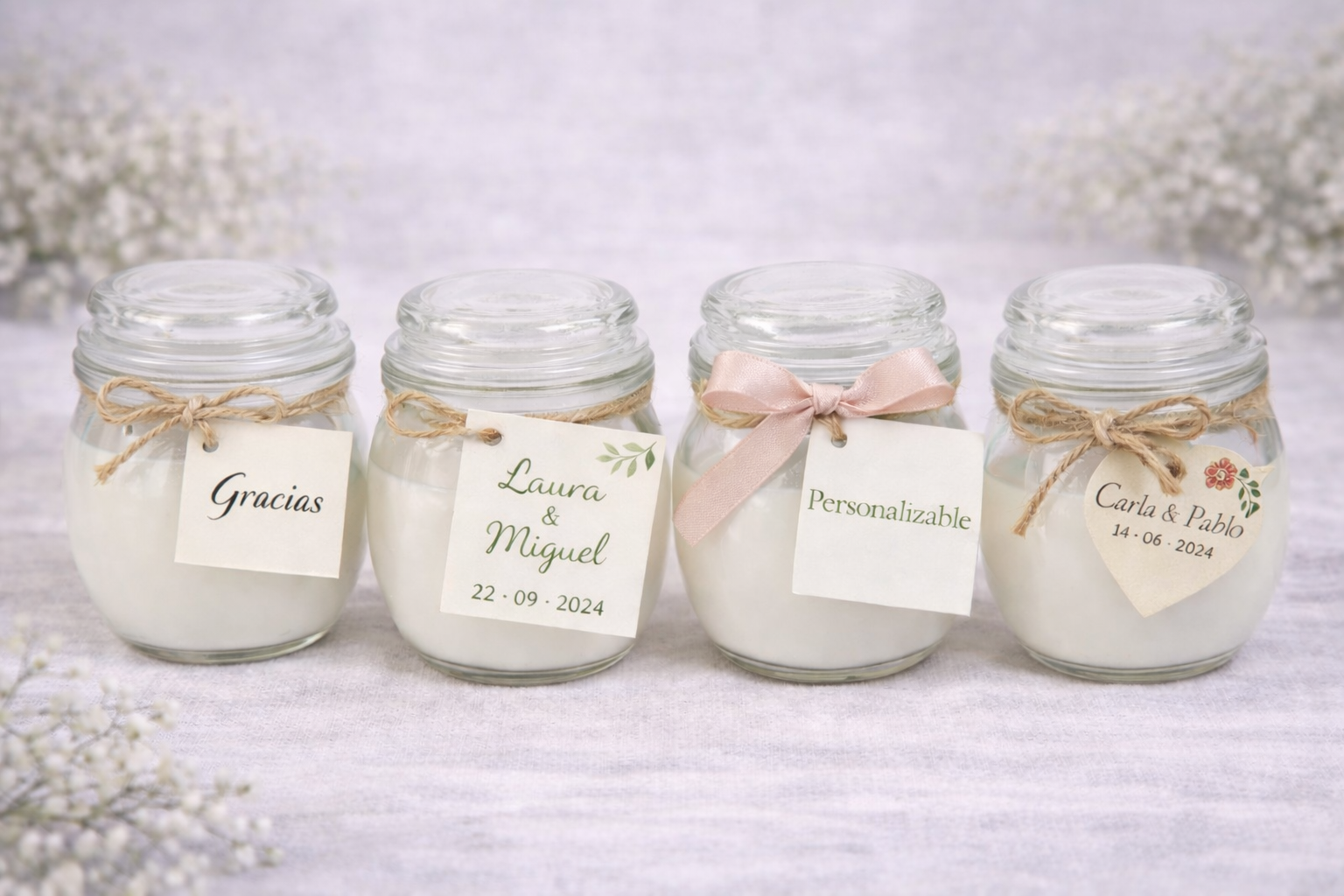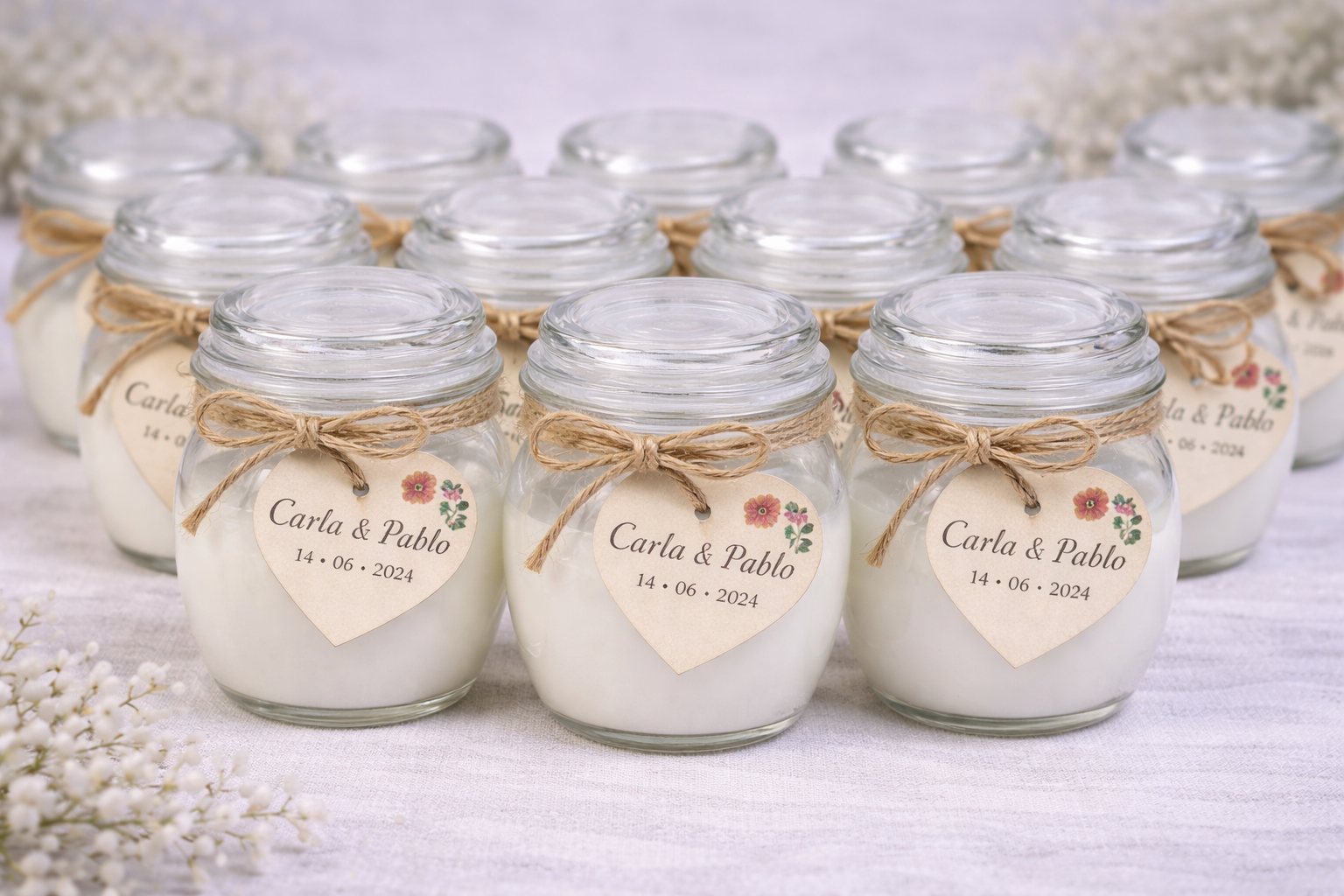 Un detalle encantador y personalizable para tus eventos más especiales. Nuestra vela aromática en frasco de cristal es la elección perfecta para sorprender a tus invitados.