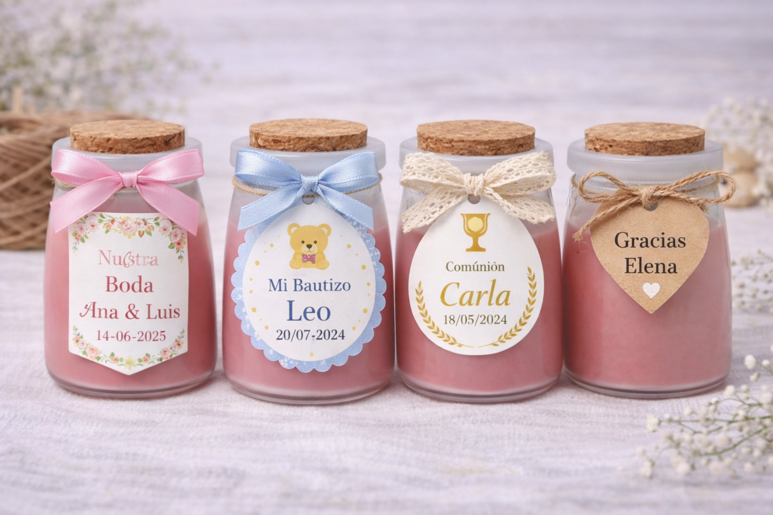 Las velas personalizadas son un regalo práctico y elegante que tus invitados apreciarán. Además, al ser totalmente personalizables, cada vela se convierte en un recuerdo único y significativo del evento. Añade un toque especial a tu celebración y haz que cada invitado se lleve un pedacito del día con ellos.